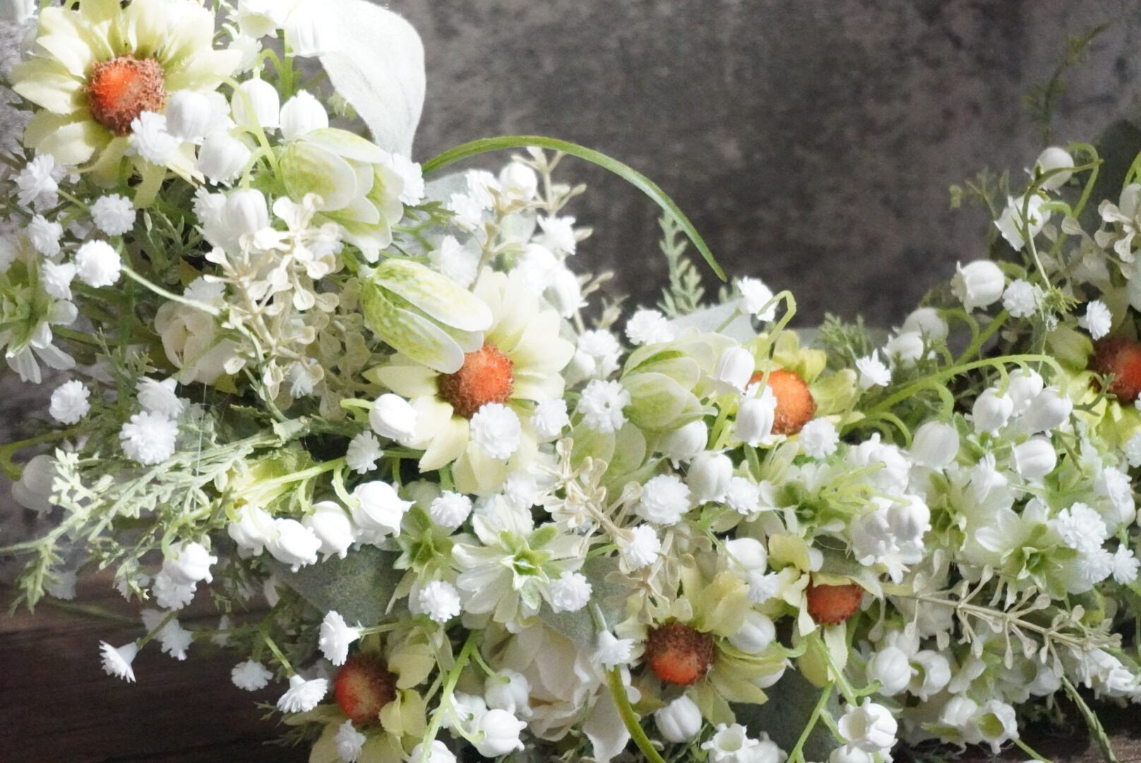 直径30cm程の可愛らしいスズランリースです。 アーティフィシャルフラワー(高品質造花)を使用しており、水やりなどの手間も要らず海外挙式など移送にも便利です。